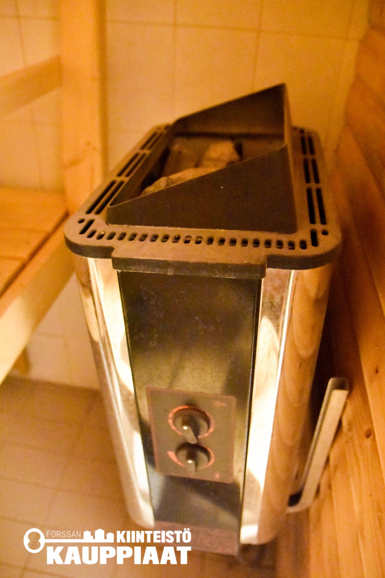 Sauna on paneloitu, ja siellä on sähkölämmitteinen kiuas. Kylpyhuone on tilava ja laatoitettu, ja siellä on paikka pyykkikoneelle. Yläkerrassa on laatoitettu wc, ja makuuhuoneita löytyy sekä ylä- että alakerrasta.